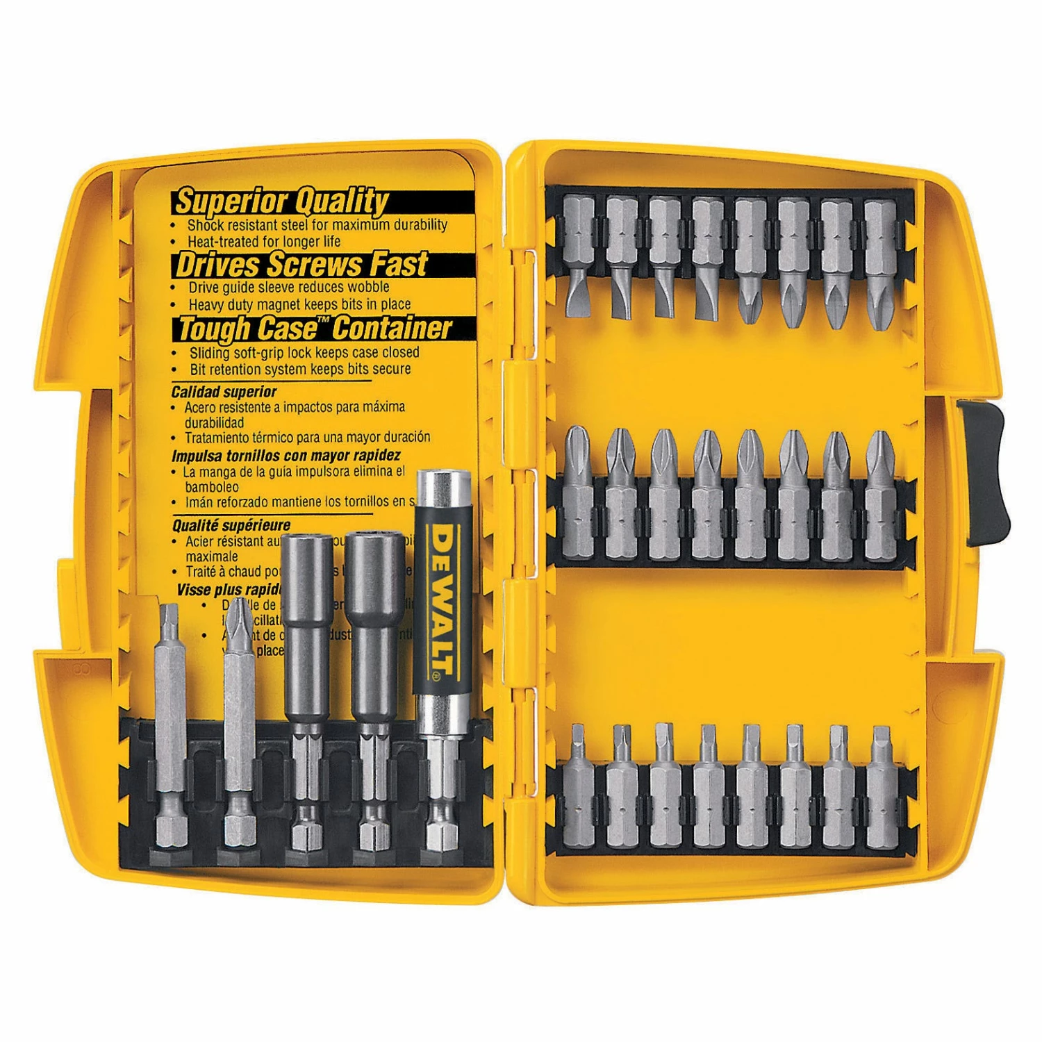 - Set includes compact drive guide, nut drivers and slotted, Phillips and square recess bits.