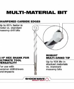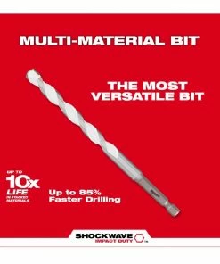 Milwaukee 1/4 in. SHOCKWAVE Carbide Multi-Material Drill Bits are the most versatile bits, designed to tackle a variety of materials, including brick, block, concrete, steel, aluminum, ceramic tile, backerboard, wood, PVC and drywall. The aggressive multi-grind carbide tip delivers up to 10X longer life in stacked materials and up to 85% faster drilling speeds in metal. Equipped with a 1/4 in. hex shank, these all-purpose drill bits are compatible with impacts, drill/drivers and hammer drills. These Milwaukee general-purpose drill bits provide the ideal all-in-one solution for the widest variety of materials, tools and applications.