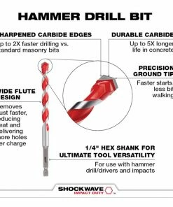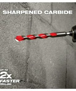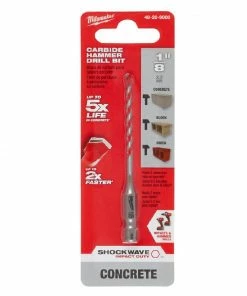 The MILWAUKEE® 1/8″ x 2″ x 3-1/2″ SHOCKWAVE™ Carbide Hammer Drill Bit uses sharpened carbide to deliver up to 5x longer life in concrete and up to 2x faster drilling into masonry material. Engineered with a precision ground tip, these bits deliver faster starts and less walking in concrete, brick, block, and masonry. The wide flute design removes dust faster, reducing heat and delivering more holes per charge. These carbide-tipped drill bits have a 1/4″ Hex Shank for versatility and are compatible with both impacts and hammer drills.