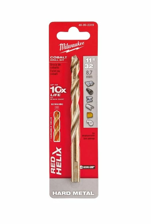 The MILWAUKEE RED HELIX Cobalt 11/32 in. Drill Bit are engineered for extreme durability and longer life in hard metal applications. The Milwaukee Cobalt drill bits are designed with a VARIABLE HELIX that includes an aggressive 35 degree Helix Angle which ends at 15 degree . The drill bits have QUADEDGE TIP to decrease heat buildup and drill faster. The 135 degree split point tip delivers a precision start and prevents walking for fast, accurate holes in Hard Metal, PVC and wood. The tapered drill bits feature a new ENHANCED TAPERED WEB that strengthens the bit’s core to increase flute durability. The cobalt twist drill bits are ideal for tough applications, providing up to 15X life vs. Black Oxide Drill Bits.