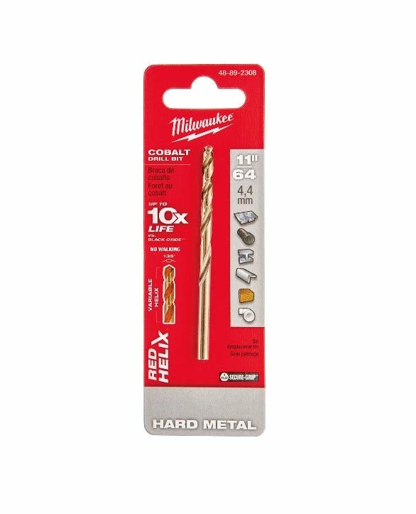Milwaukee Cobalt Drill Bits with Red Helix are engineered with a Variable Helix that starts with an aggressive 35° cutting edge which ends at 15° providing Faster Material Removal. Aiding in material removal the Chip Breaker decreases the size of chips leading to less heat buildup to Stay Sharper Longer. The 135° split point tip delivers a precision start and prevents walking for fast, accurate holes.