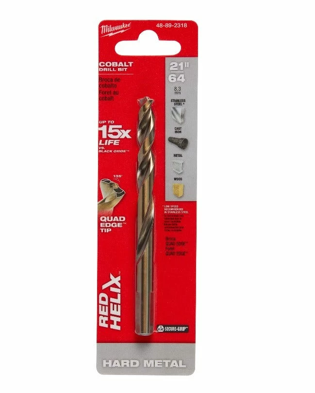 The MILWAUKEE RED HELIX Cobalt 21/64 in. Drill Bit are engineered for extreme durability and longer life in hard metal applications. The Milwaukee Cobalt drill bits are designed with a VARIABLE HELIX that includes an aggressive 35 degree Helix Angle which ends at 15 degree . The drill bits have QUADEDGE TIP to decrease heat buildup and drill faster. The 135 degree split point tip delivers a precision start and prevents walking for fast, accurate holes in Hard Metal, PVC and wood. The tapered drill bits feature a new ENHANCED TAPERED WEB that strengthens the bit’s core to increase flute durability. The cobalt twist drill bits are ideal for tough applications, providing up to 15X life vs. Black Oxide Drill Bits.