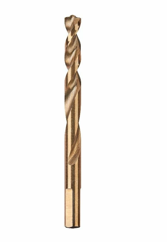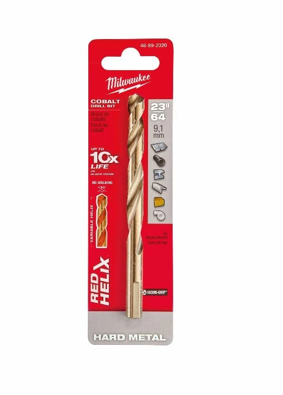 The MILWAUKEE RED HELIX Cobalt 23/64 in. Drill Bit are engineered for extreme durability and longer life in hard metal applications. The Milwaukee Cobalt drill bits are designed with a VARIABLE HELIX that includes an aggressive 35 degree Helix Angle which ends at 15 degree . The drill bits have QUADEDGE TIP to decrease heat buildup and drill faster. The 135 degree split point tip delivers a precision start and prevents walking for fast, accurate holes in Hard Metal, PVC and wood. The tapered drill bits feature a new ENHANCED TAPERED WEB that strengthens the bit’s core to increase flute durability. The cobalt twist drill bits are ideal for tough applications, providing up to 15X life vs. Black Oxide Drill Bits.