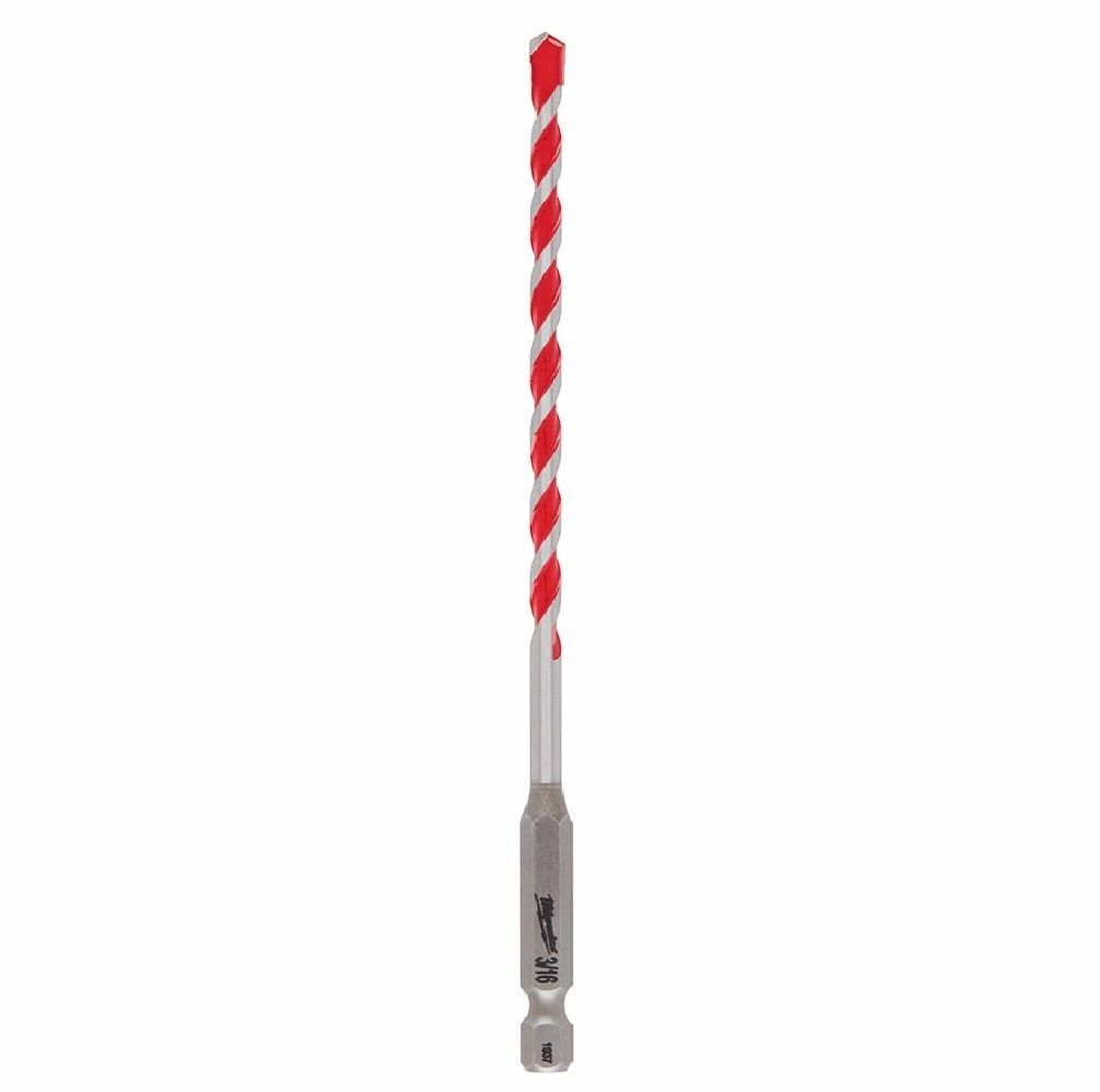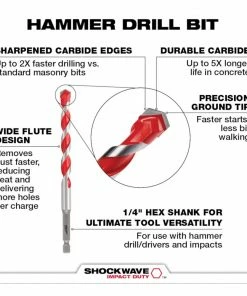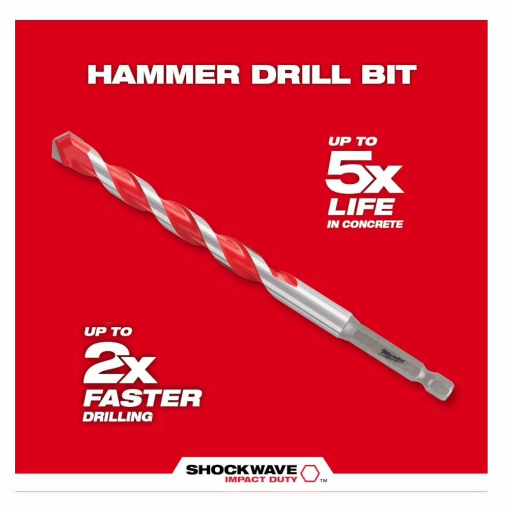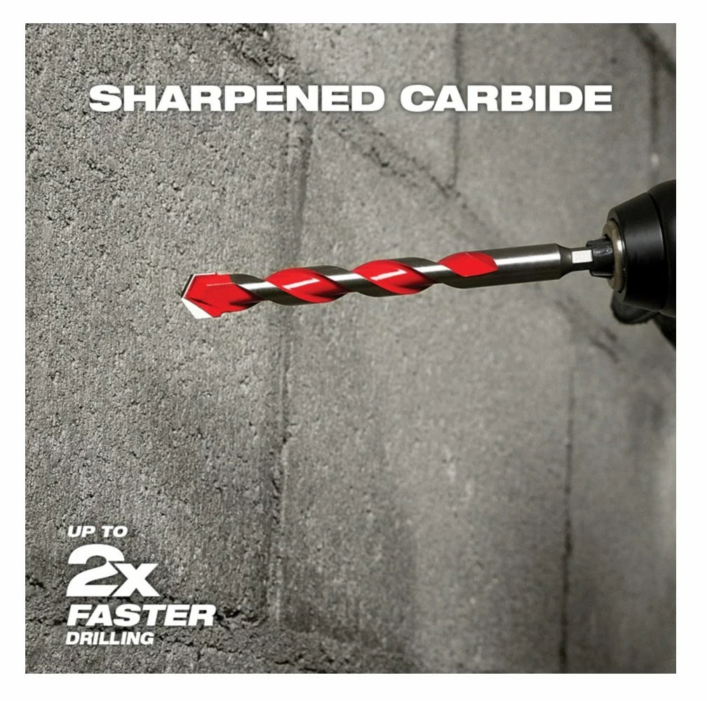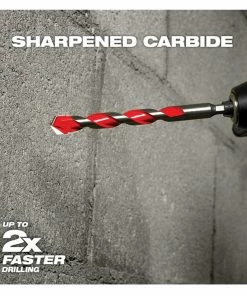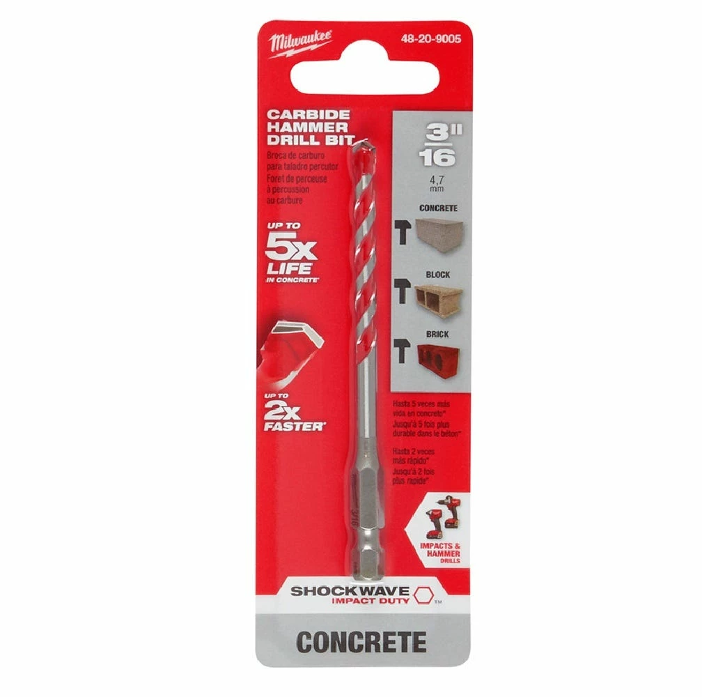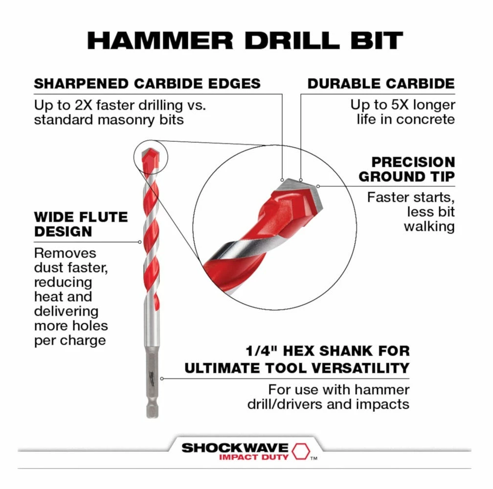 The MILWAUKEE® 3/16″ x 2″ x 4″ SHOCKWAVE™ Carbide Hammer Drill Bit uses sharpened carbide to deliver up to 5x longer life in concrete and up to 2x faster drilling into masonry material. Engineered with a precision ground tip, these bits deliver faster starts and less walking in concrete, brick, and block. The wide flute design removes dust faster, reducing heat and delivering more holes per charge. These carbide-tipped drill bits have a 1/4″ Hex Shank for versatility and are compatible with both impacts and hammer drills.