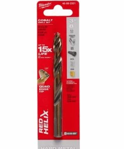 The MILWAUKEE RED HELIX Cobalt 3/8 in. Drill Bit are engineered for extreme durability and longer life in hard metal applications. The Milwaukee Cobalt drill bits are designed with a VARIABLE HELIX that includes an aggressive 35 degree Helix Angle which ends at 15 degree . The drill bits have QUADEDGE TIP to decrease heat buildup and drill faster. The 135 degree split point tip delivers a precision start and prevents walking for fast, accurate holes in Hard Metal, PVC and wood. The tapered drill bits feature a new ENHANCED TAPERED WEB that strengthens the bit’s core to increase flute durability. The cobalt twist drill bits are ideal for tough applications, providing up to 15X life vs. Black Oxide Drill Bits.