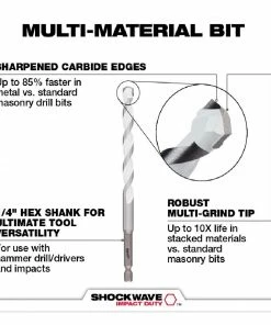 Milwaukee 3/8 in. SHOCKWAVE Carbide Multi-Material Drill Bits are the most versatile bits, designed to tackle a variety of materials, including brick, block, concrete, steel, aluminum, ceramic tile, backerboard, wood, PVC and drywall. The aggressive multi-grind carbide tip delivers up to 10X longer life in stacked materials and up to 85% faster drilling speeds in metal. Equipped with a 1/4 in. hex shank, these all-purpose drill bits are compatible with impacts, drill/drivers and hammer drills. These Milwaukee general-purpose drill bits provide the ideal all-in-one solution for the widest variety of materials, tools and applications.