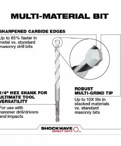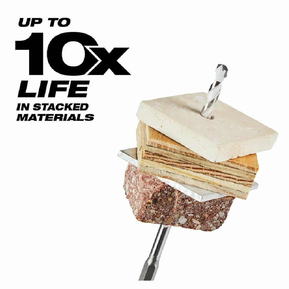 Milwaukee 5/16 in. SHOCKWAVE Carbide Multi-Material Drill Bits are the most versatile bits, designed to tackle a variety of materials, including brick, block, concrete, steel, aluminum, ceramic tile, backerboard, wood, PVC and drywall. The aggressive multi-grind carbide tip delivers up to 10X longer life in stacked materials and up to 85% faster drilling speeds in metal. Equipped with a 1/4 in. hex shank, these all-purpose drill bits are compatible with impacts, drill/drivers and hammer drills. These Milwaukee general-purpose drill bits provide the ideal all-in-one solution for the widest variety of materials, tools and applications.