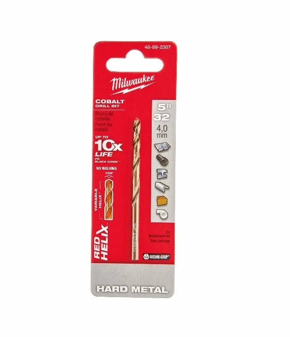 The MILWAUKEE RED HELIX Cobalt 5/32 in. Drill Bit are engineered for extreme durability and longer life in hard metal applications. The Milwaukee Cobalt drill bits are designed with a VARIABLE HELIX that includes an aggressive 35 degree Helix Angle which ends at 15 degree . The 135 degree split point tip delivers a precision start and prevents walking for fast, accurate holes in Hard Metal, PVC and wood. The tapered drill bits feature a new ENHANCED TAPERED WEB that strengthens the bit’s core to increase flute durability. The cobalt twist drill bits are ideal for tough applications, providing up to 15X life vs. Black Oxide Drill Bits.