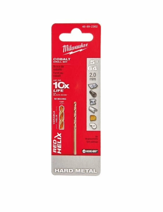 Milwaukee Cobalt Drill Bits with Red Helix are engineered with a Variable Helix that starts with an aggressive 35° cutting edge which ends at 15° providing Faster Material Removal. Aiding in material removal the Chip Breaker decreases the size of chips leading to less heat buildup to Stay Sharper Longer. The 135° split point tip delivers a precision start and prevents walking for fast, accurate holes.