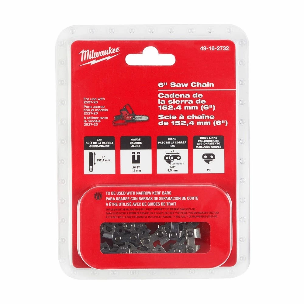 The Milwaukee 6 in. Saw Chain is to be used with the Milwaukee M12 FUEL HATCHET 6 in. Pruning Saw (2527-20). The Full House Chain features a cutter on every drive link, which minimizes vibration and delivers clean cuts. The design delivers fast cuts and minimizes kickback to meet the ANSI B175.1 Standard. The saw chain has a durable design and is weather-resistant for increased life.