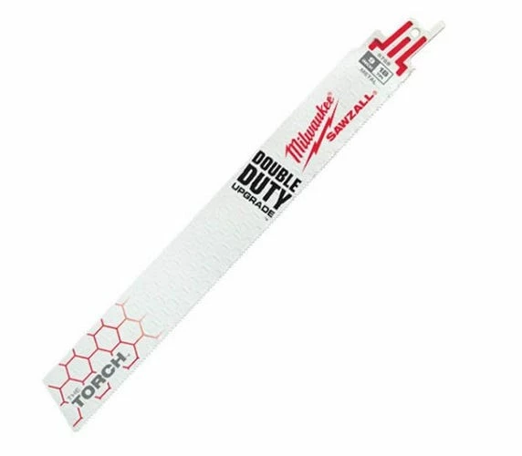 The Milwaukee 9 in. x 10 TPI Torch metal-cutting blades with the Double Duty Upgrade feature a tooth form optimized for the longest life and maximum durability. The tough neck is engineered to protect against tang breakage and delivers the strongest SAWZALL blade tang on the market. The grin iron features a stamped honeycomb pattern throughout the body of the blade that greatly increases the rigidity of the blade, making it the stiffest metal cutting SAWZALL blade on the market. Ideal for making tough, straight cuts, these ice-hardened blades are cryogenically treated for up to 50% longer life.