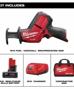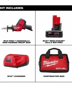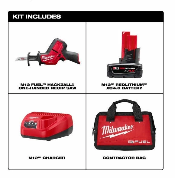 - Includes 2520-20 M12 FUEL Hackzall reciprocating saw, multi-material blade, 48-59-2401 M12 lithium-ion battery charger, 48-11-2440 M12 RedLithium XC 4.0 Ah battery and contractor bag