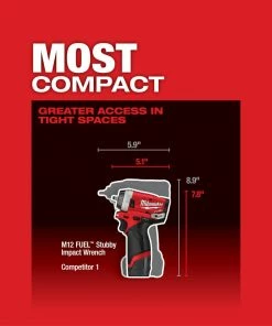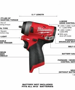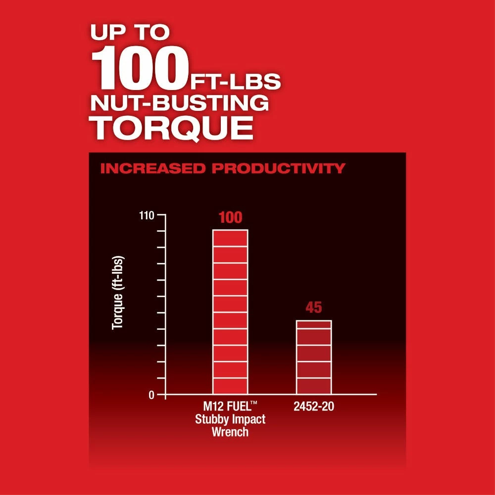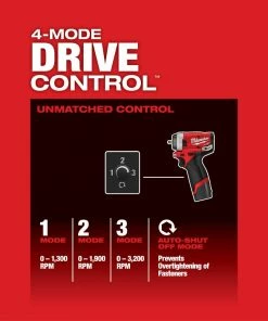 The M12 FUEL Cordless Brushless 1/4 in. Stubby Impact Wrench is the industries most compact impact wrench on the market place. Measuring only 5.1 in. in length, this tool fits in tighter spaces, making users more productive. Increased torque delivers an industry leading 100 ft.-lbs. of breakaway torque, removing even the most stubborn bolts and fasteners. 4-Mode Drive Control, will allow unmatched control in various fastening applications. 1-3 RPM allows for precision control, and Auto-Shut Off Mode in the 4th setting will prevent over fastening of bolts while doing reassembly work.
