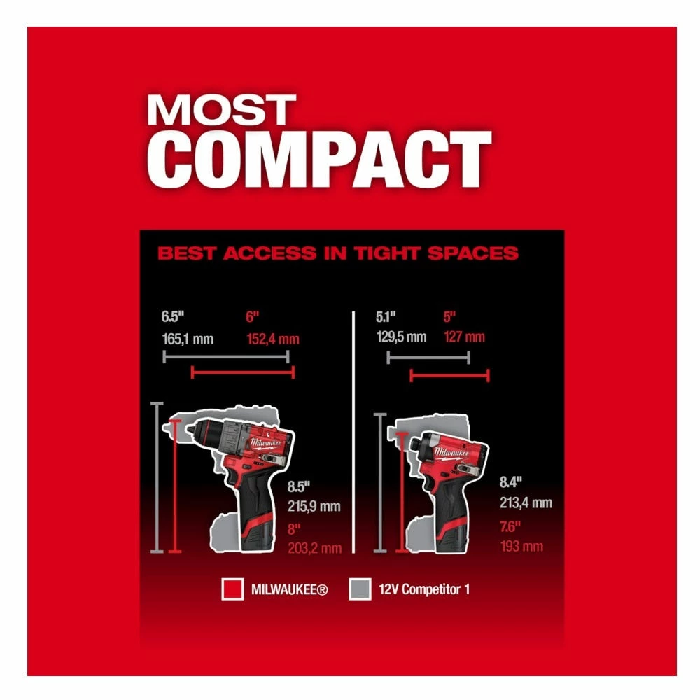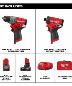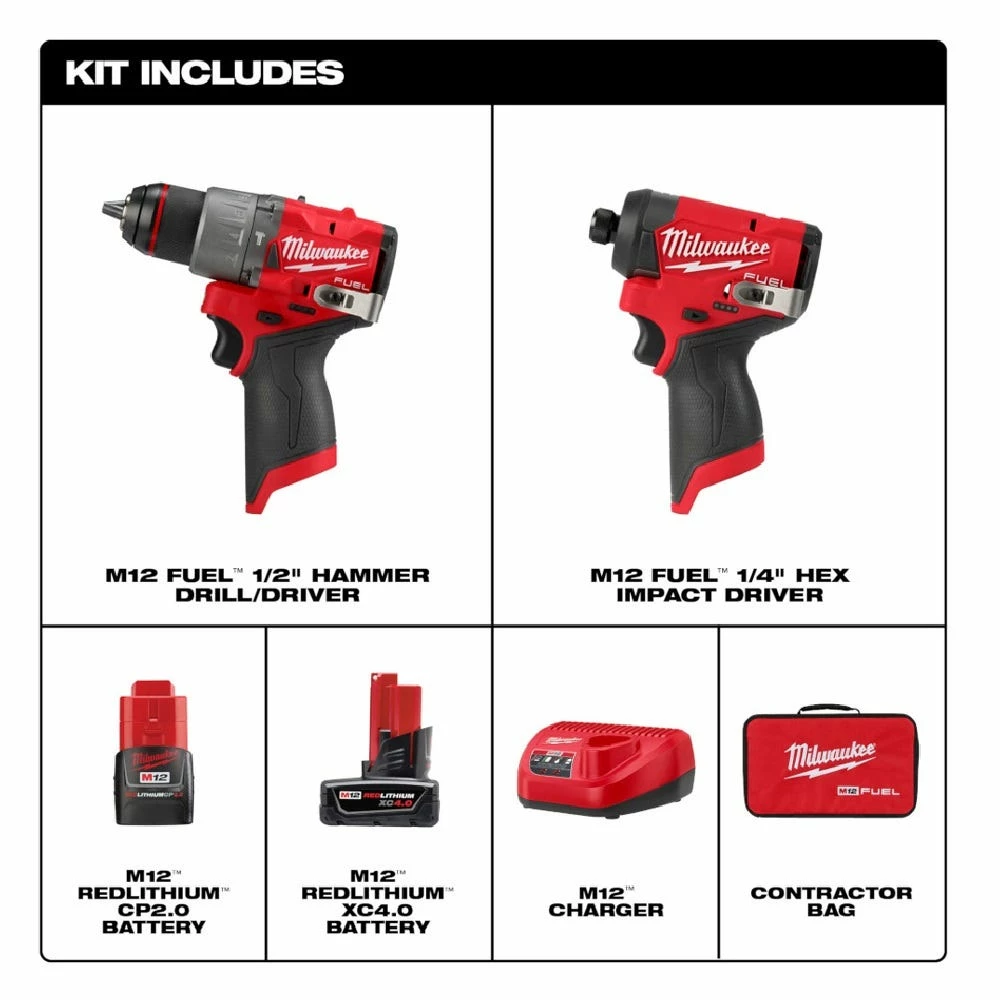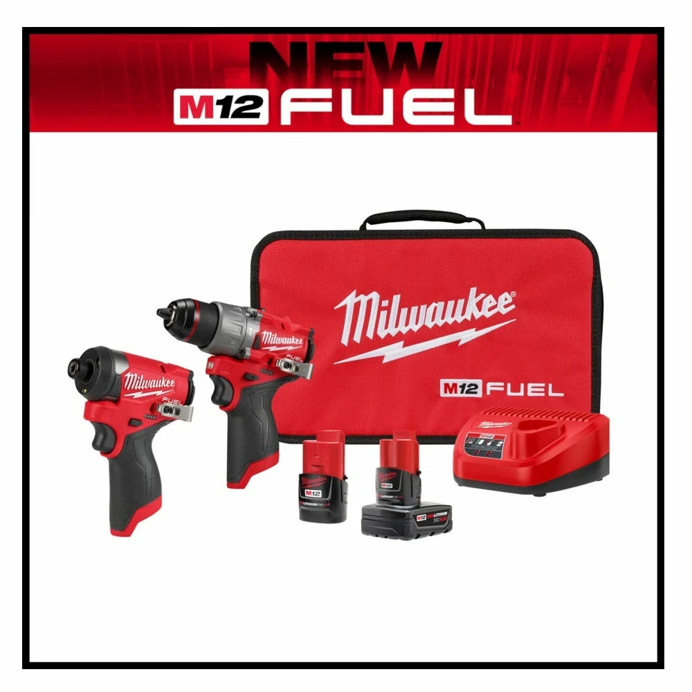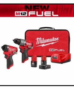 MILWAUKEE® M12 FUELâ„¢ 2-Tool Combo Kit has the Most Powerful Subcompact Drill, the Fastest Driving Subcompact Impact Driver while being the overall Most Compact Drill and Impact Driver. Includes MILWAUKEE® M12 FUELâ„¢ 1/2″ Drill Driver, M12 FUELâ„¢ 1/4″ Hex Impact Driver, M12 REDLITHIUMâ„¢ XC 4.0Ah Battery Pack, M12 REDLITHIUMâ„¢ CP 2.0Ah Battery Pack, with an M12 charger and a contractor bag. The M12 FUELâ„¢ 1/2″ Drill/Driver is the Most Powerful Subcompact Drill Driver, the most compact in size, and has the fastest speed under load. The POWERSTATEâ„¢ brushless motor delivers the most power on the widest variety of applications. The portable drill is the shortest solution in its class offering maneuverability and access to tight spaces. MILWAUKEE® REDLINK PLUSâ„¢ Intelligence delivers top of the line thermal performance to give users the Fastest Speed Under Load. MILWAUKEE® M12 FUELâ„¢ 1/4″ Hex Impact Driver is the Fastest Subcompact Impact Driver, the Most Compact, and provides Maximum Workspace Visibility. At 5″ long and 7.6″ tall (with M12 CP 2.0 Ah battery), this solution is the most overall compact impact driver in its class. Tri-LEDs surround the bit accessory with brighter lights and fewer shadows providing maximum visibility. Using M12 REDLITHIUMâ„¢ 2.0Ah compact and 4.0Ah extended capacity battery packs will deliver more work per charge. The M12 FUELâ„¢ Impact Driver and M12 FUELâ„¢ 1/2″ Drill Driver are part of MILWAUKEE® M12â„¢ System which is fully compatible with over 125 solutions.
