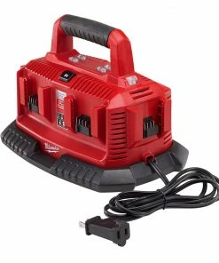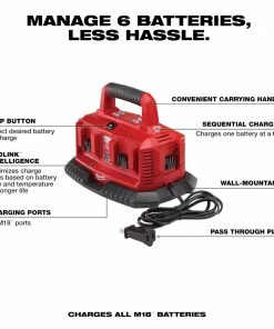 The Milwaukee 48-59-1806 is a M18 Sequential 6 Port Charger. The charger holds up to 6 batteries at a time, and charges them sequentially, 1 at a time. The charger also offers a compact design, integrated hang holes for vertical mounting, and a pass through plug to conserve outlet space. The new unit will charge M18 compact batteries in 30-minutes, and extended capacity (XC) batteries in 60-minutes. With this new 6-pack charger, users can reduce the amount of time spent changing out batteries, increasing productivity on the jobsite.