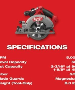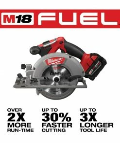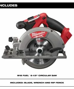 The M18 FUEL 6-1/2 in. Circular Saw is the fastest saw in its class, offering up to 30% faster cutting, 2x more runtime and 3x longer tool life than competitive saws. The POWERSTATE Brushless Motor outpowers all other 18-Volt cordless circular saws and allows you to perform jobs that previously required a corded tool. The M18 REDLITHIUM XC5.0 Extended Capacity Battery Pack (not included) delivers up to 2.5x more runtime and provides more work per charge and more work over the life of the pack than competitive batteries. The saw’s REDLINK PLUS Intelligence ensures optimized performance and protection from overloading, overheating and over-discharging. The 18-volt lithium-ion circular saw’s guards and shoe are built of cast magnesium to provide a durable, lightweight base. The saw also features an integrated LED light and a rafter hook for convenient storage on the job. The saw includes a blade wrench and a blade.