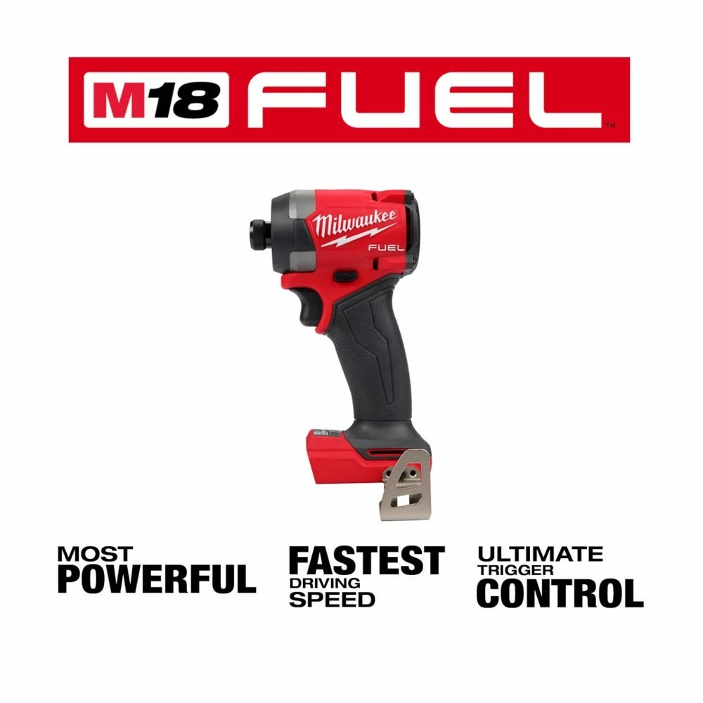 The MILWAUKEE® M18 FUEL™ ¼” Hex Impact Driver is the Most POWERFUL and FASTEST DRIVING impact driver, featuring ULTIMATE TRIGGER CONTROL. MILWAUKEE® POWERSTATE™ Brushless motor delivers unmatched power for a full range of capabilities to complete the widest variety of applications. Increase productivity on the jobsite with the fastest driving speed of any impact driver without sacrificing power or control. MILWAUKEE® REDLINK PLUS™ intelligence delivers ULTIMATE TRIGGER CONTROL by providing smooth acceleration for small fasteners to prevent stripping of screws or damaging of materials. MILWAUKEE® M18™ REDLITHIUM™ Battery Packs deliver more work per charge and more work over the life of the pack. Featuring 4-mode drive control provides users with greater control over output speed and power. Self-Tapping Screw Mode is designed to reduce walking when starting self-tapping screws as well as reduce overdriving, breaking, and stripping out screws. This new impact driver also features Tri-LED lighting, illuminating the area of work while eliminating shadows. The M18 FUEL ¼” Hex Impact Driver is part of MILWAUKEE® M18 system which is fully compatible with over 200+ solutions.