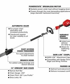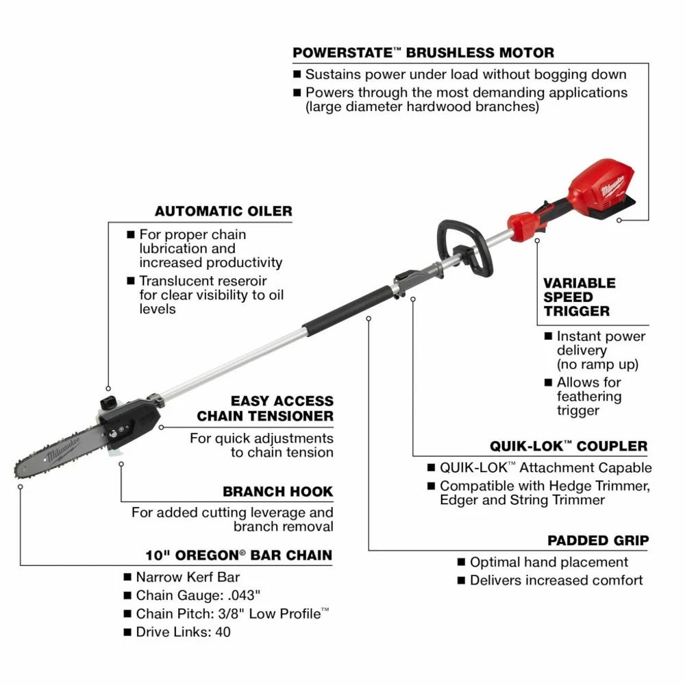 The MILWAUKEE® M18 FUEL™ 10″ Pole Saw w/ QUIK-LOK™ meets the needs of landscape maintenance professionals, giving them the power to cut hardwood branches, reach full throttle in under 1 second, and delivers up to 150 cuts per charge. The cordless pole saw features two components – the M18 FUEL™ Power Head w/ QUIK-LOK™ and QUIK-LOK™ 10” Pole Saw Attachment. This M18 FUEL™ Power Head, part of the M18 FUEL™ QUIK-LOK™ Attachment System, is compatible with multiple attachments such as an Edger, Articulating Hedge Trimmer, and String Trimmer attachment. Professionals can quickly swap out attachments on a single Power Head, delivering ultimate versatility and a lower cost of ownership. The POWERSTATE™ Brushless Motor gives the power to maintain its speed in demanding applications without bogging down, outperforming higher voltage systems. The motor is in the rear of the pole saw to provide the best combination of power, balance, and maneuverability. REDLINK PLUS™ intelligence delivers maximum performance and protection from overload, overheating, and over-discharge. The advanced electronic package also delivers instant throttle response and a variable speed trigger for ultimate control.