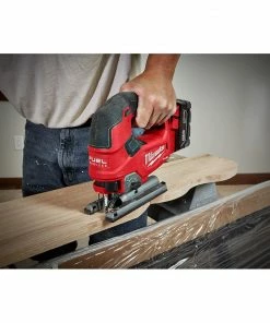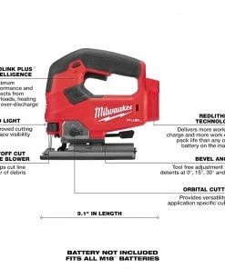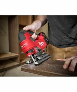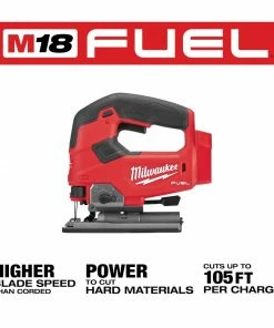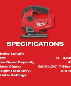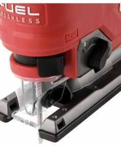 The M18 FUEL Brushless Cordless D-Handle Jig Saw combines power, blade speed and precision, to provide the highest quality cuts in a wide variety of materials. The M18 FUEL D-Handle Jig saw leverages the POWERSTATE Brushless Motor and REDLINK PLUS Intelligence to provide higher blade speed than corded jig saws at 3500 strokes per minute for clean controlled cuts with minimized chipping or bucking. Leveraging the M18 REDLITHIUM XC 5.0 Ah battery the M18 FUEL D-Handle Jig Saw provides up to 105 lin. ft. of cutting in laminated particle board, delivering all day productivity with less trips to the charger. The saw features tool-less blade change, tool free bevel adjust with detents at 0, 15, 30, and 45 as well as an LED light and on/off blower to keep the cut line visible while cutting.