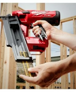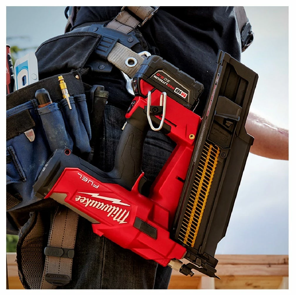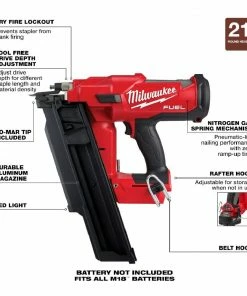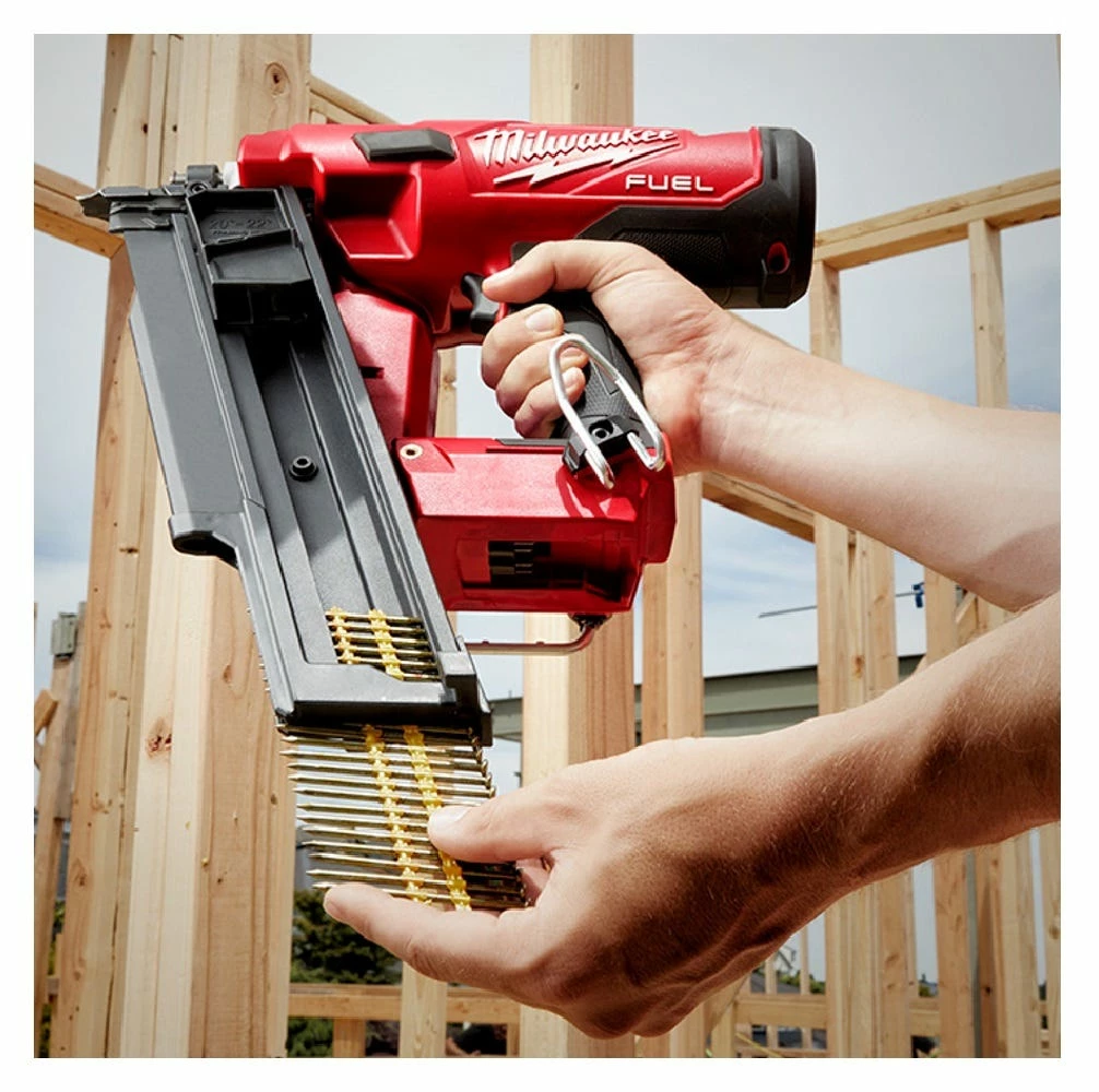 The MILWAUKEE® M18 FUEL™ 21 Degree Framing Nailer sets the new standard for cordless framing nailers. It has a nitrogen spring mechanism, POWERSTATE™ brushless motor, and REDLINK™ Intelligence, providing pneumatic performance and cordless convenience. The framing nailer can sink full round head nails into dense engineered lumber to tackle the most demanding framing applications. To increase productivity and efficiency, the framing gun fires 3 nails per second with zero ramp-up time, firing a nail as soon as the trigger is pulled. The cordless framing nailer uses only Milwaukee’s REDLITHIUM™ Batteries (not included) and sealed compressed nitrogen to drive each nail, eliminating the cost of gas cartridges and associated maintenance. The M18 FUEL™ 21 Degree Framing Nailer delivers pneumatic performance and durability that professional carpenters and remodelers expect, without the hassle of a compressor and hose or gas cartridge.