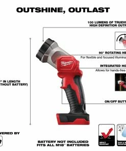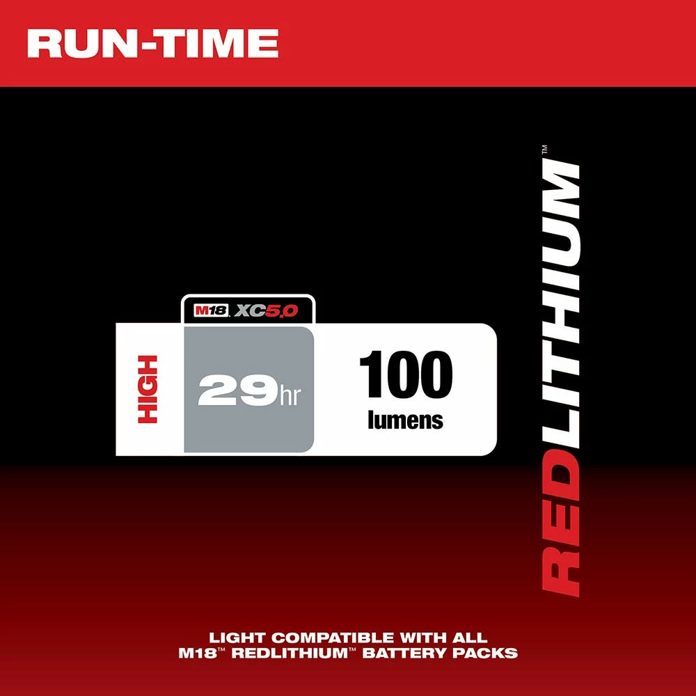 The MILWAUKEE M18 Work Light lasts 600X longer than conventional incandescent light bulbs. The LED work light is powered by M18 REDLITHIUM batteries, running up to 4X longer on a single charge. The work light features a 135 degree rotating head to easily direct the light beam at the desired work area and an integrated hook allows for hands-free use. The cordless work light features a sealed aluminum head to provide impact and weather resistance and comes with a limited lifetime LED warranty, the LEDs never need to be replaced.