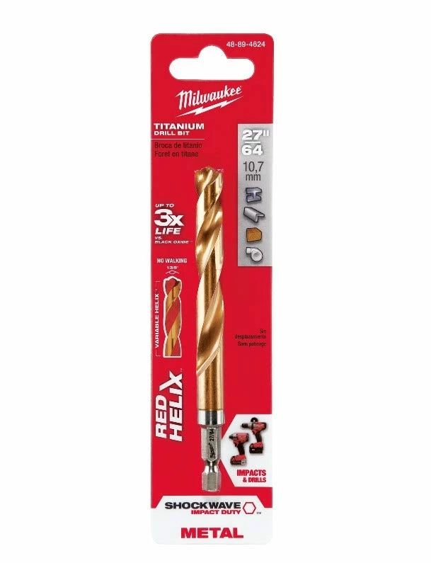 Milwaukee® SHOCKWAVE™ Impact Duty Titanium Drill Bits with RED HELIX™ are engineered for impacts and drills.  Designed with a Variable Helix with an aggressive 35° Helix Angle which ends at 15°, the Impact Duty Titanium Drill bits with RED HELIX provide Rapid Chip Removal to limit heat buildup to Stay Sharper Longer. The 135° split point tip delivers a precision start and prevents walking for fast, accurate holes. Titanium coating can be used in all drilling applications to give you up to 3X life vs. Black Oxide Drill Bits.