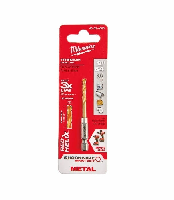 Milwaukee® SHOCKWAVE™ Impact Duty Titanium Drill Bits with RED HELIX™ are engineered for impacts and drills. Designed with a Variable Helix with an aggressive 35° Helix Angle which ends at 15°, the Impact Duty Titanium Drill bits with RED HELIX provide Rapid Chip Removal to limit heat buildup to Stay Sharper Longer. The 135° split point tip delivers a precision start and prevents walking for fast, accurate holes. Titanium coating can be used in all drilling applications to give you up to 3X life vs. Black Oxide Drill Bits.