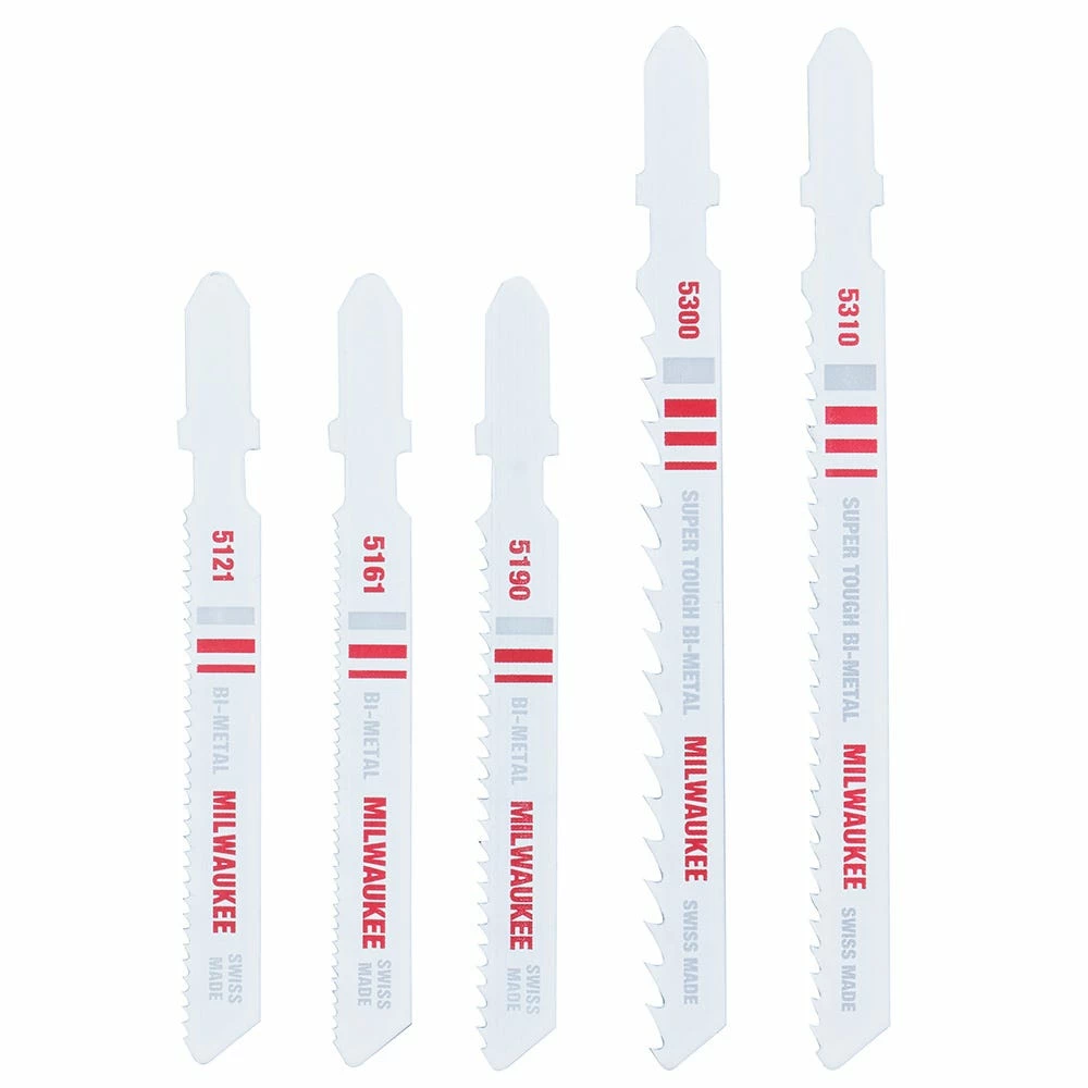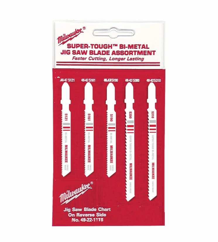 Milwaukee Bi-Metal Jig Saw blades are designed and manufactured for the professional user. Bi-metal blades last longer than high speed steel or carbon blades. Detail to the material used, tooth shape and sharpness make these blades cut clean, fast and have a longer life. These blades use a T-Shank and fit Milwaukee Jig Saws 6266-6, 6276-6, 6267-20, 6267-21 and other popular brands. Includes 5 individual blades