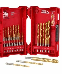 The MILWAUKEE 23 Piece SHOCKWAVE RED HELIX Titanium Drill Bit Set is engineered for extreme durability and long life. The QUAD EDGE tip delivers a precision start and four cutting edges to create smaller chips for faster removal and less heat leading to longer bit life. Designed with a Variable Helix that includes an aggressive 35 degree helical angle, which ends at 15 degree , these tapered drill bits with RED HELIX provide Rapid Chip Removal limiting heat buildup to Stay Sharper Longer. The bits also feature an internal ENHANCED TAPERED WEB that greatly increases their strength, reducing premature breakage. Ideal for various applications including but not limited to wood, plastics, and metals, Milwaukee Red Helix Titanium Drill Bits provide up to 5X life vs. black oxide drill bits.
