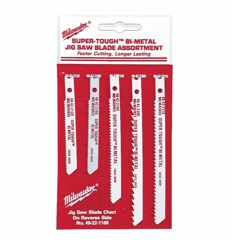This kit contains the most popular Jig Saw Blades with a 1/4 inch universal tang. These blades fit Milwaukee Jig Saw model 6256-6 and other popular Jig Saws with this tang configuration. Assortment includes one each -2120 for metal over 1/8 inch, -2160 for metal under 1/8 inch, -2190 for metal over 1/4 inch, -2300 for nail embedded wood, and -2310 for nail embedded wood.
