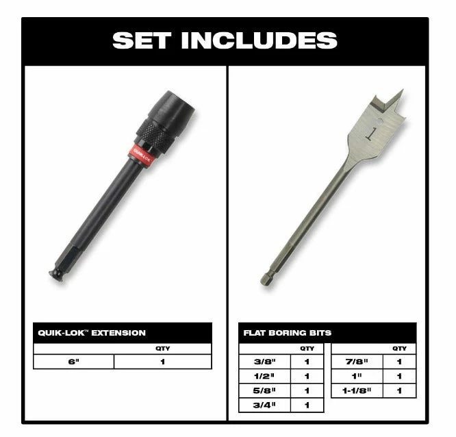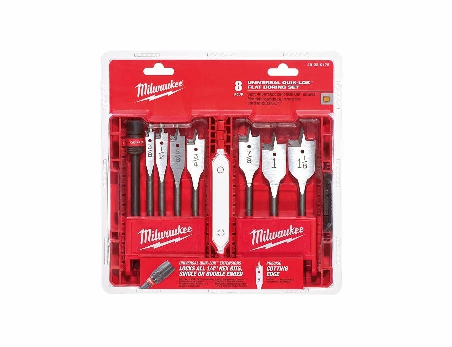 The MILWAUKEE 8-Piece 6 in. Universal QUIK-LOK Flat Boring Bit Set adds convenience and reach for boring holes at any angle in wood. Bore small, clean holes at any angle in a variety of wood materials. The double wing spurs provide easy hole formation while reducing vibration and preventing break out. The patented cutting edge on the spade bit produces easier and faster wood boring and fast chip removal, allowing heat from the bit to dissipate. Universal QUIK-LOK design allows quick and easy accessory changes, as well as added reach in hard-to-work areas. The kit includes 3/8 in., 1/2 in., 5/8 in., 3/4 in., 7/8 in., 1 in. and 1-1/8 in. boring bits plus a 6 in. QUIK-LOK Extension in a carrying case.