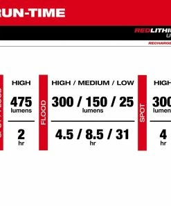 - Spot/Flood Mode: 475 Lumens- 2.25 Hrs. Flood High Mode: 300 Lumens- 5 Hrs. Flood Medium Mode: 150 Lumens- 9 Hrs. Flood Low Mode: 100 Lumens- 33 Hrs. Spot High Mode: 300 Lumens- 4.5 Hrs.